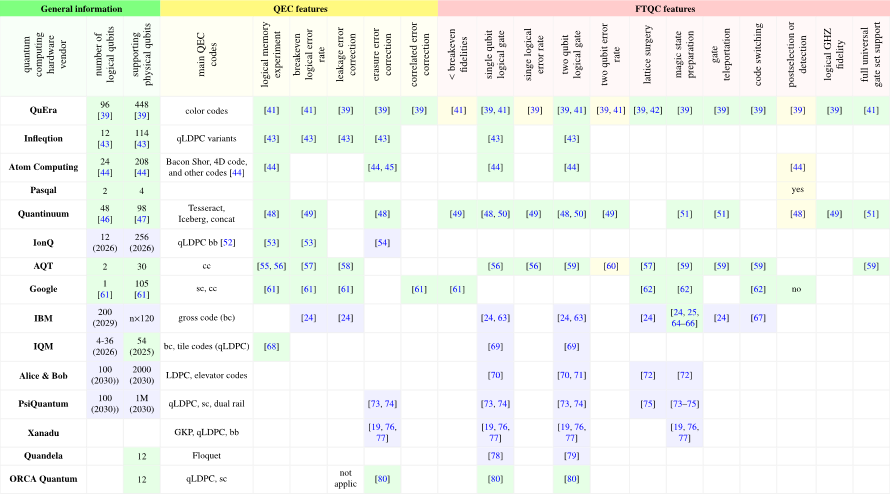 - Introduction which looks at what computer information science specialists may look for in industry vendor achievements as well as roadmaps, and how to find it. It describes the difference between quantum error correction and fault-tolerant quantum computing. It summarizes in a large table the key figures of merit of QEC and FTQC to look at when evaluating vendor’s achievements (below, look at the paper for the caption).